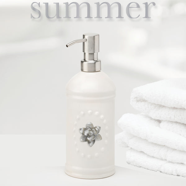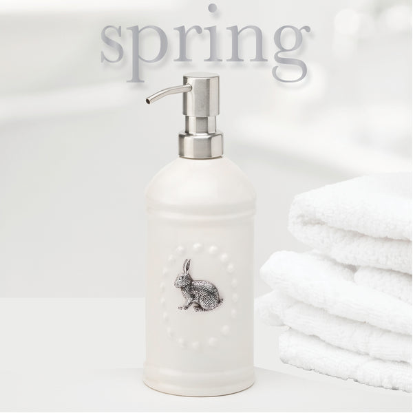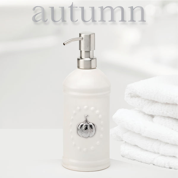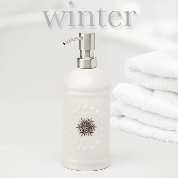 Perfect for every season.  Features an embossed texture and stainless steel pump. The perfect addition to your home and a thoughtful gift for someone you love!  Comes with 5 metal magnets that adhere to front so you can change for each season!  8 1/2" Tall x 3" Wide. Metal magnets included: rabbit, flower, pumpkin, snowflake and heart.