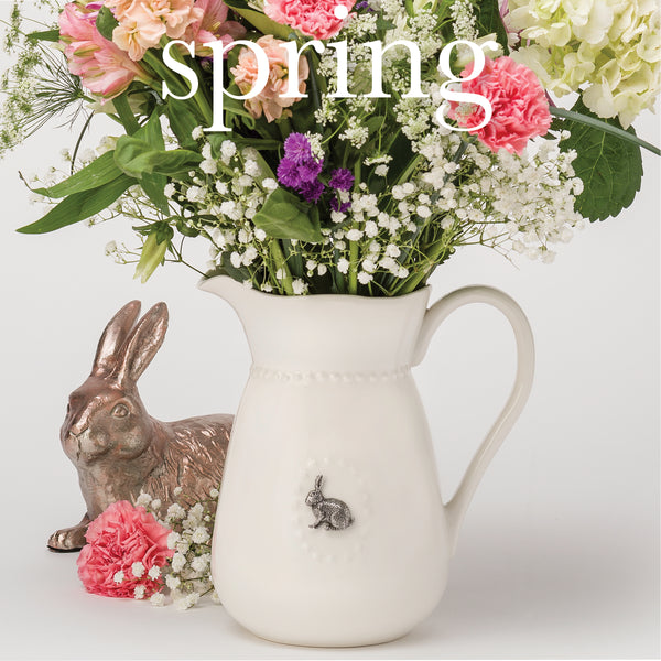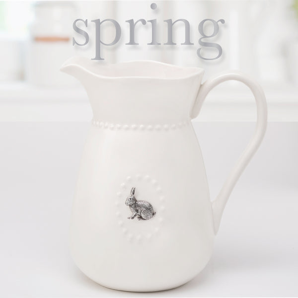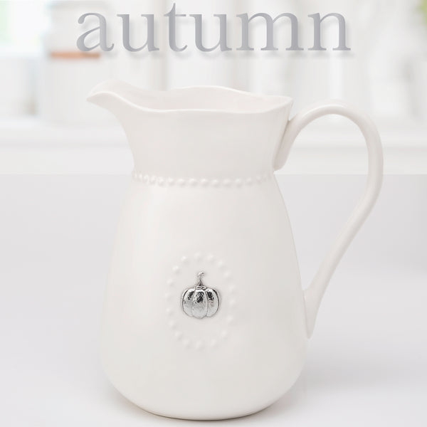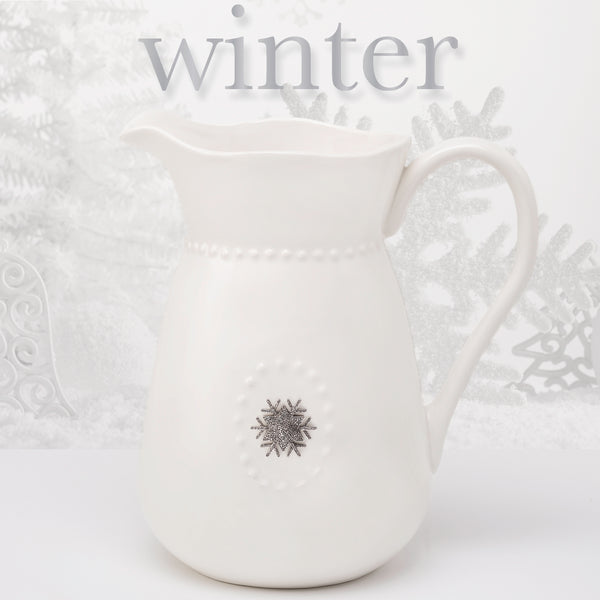 Beautiful white ceramic water pitcher that coordinates with all home decor and dinnerware sets. Perfect for everyday use as well as seasonal entertaining. Comes with 5 different metal seasonal magnets that will be a delight to use throughout the year. Set includes a rabbit, flower, heart, pumpkin and snowflake. Pitcher holds 3 quarts (96 oz.).