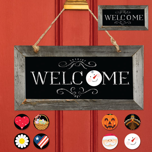 This weathered looking sign will be ready to welcome friends and family all year long! Use with or without seasonal elements for a charming addition to your entryway or your front door. It is a large 13” wide and 6.5” tall, not including the hemp for hanging. Each seasonal element can slip easily over nail to create many different looks. Set includes the sign, hemp cord for hanging and 4 reversible season designed tags to hang on sign.